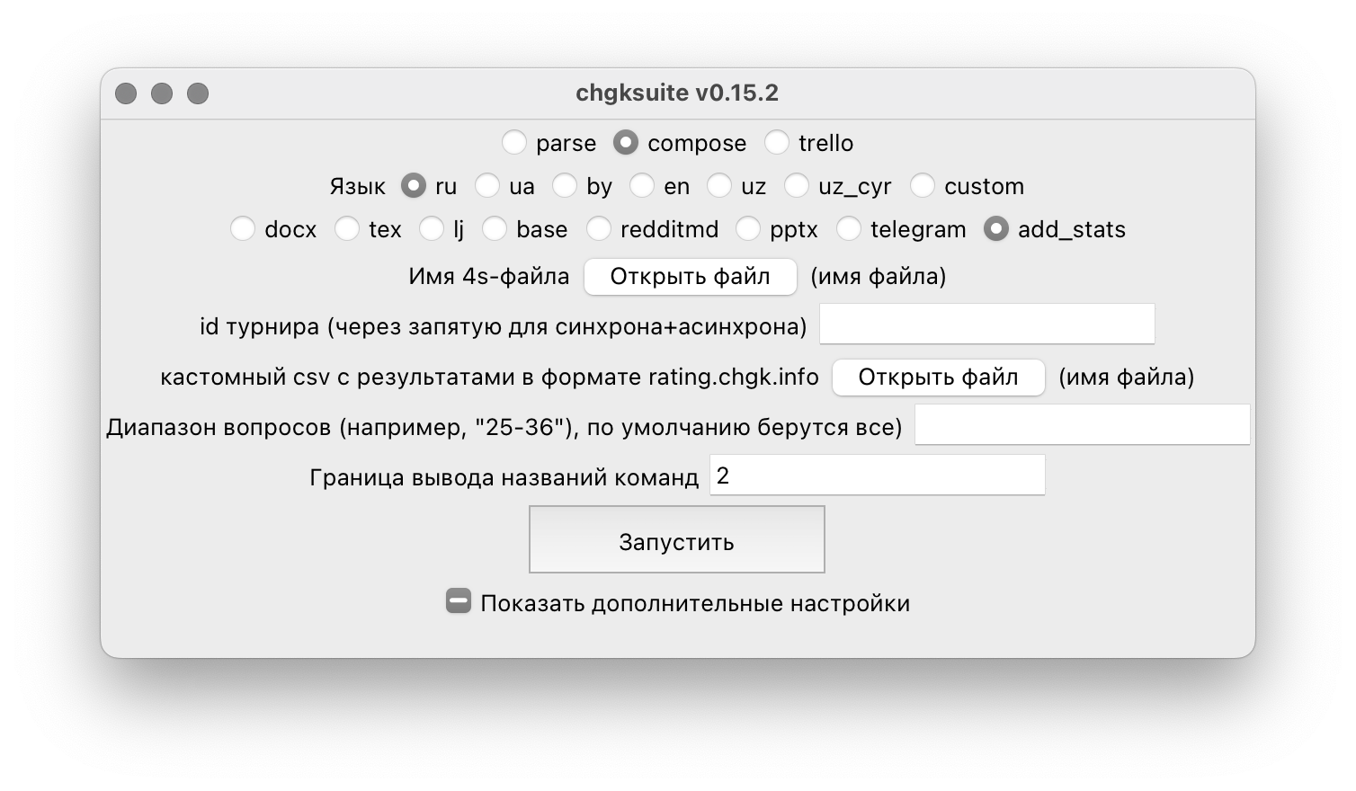 Иногда вы хотите выложить, скажем, только один тур из трёх. Тогда вам нужно указать диапазон вопросов, например 25-36. Это значит, что к вопросу 1 в пакете подклеится статистика из вопроса 25 с турнирного сайта, к вопросу 2 — из вопроса 26, и так далее.