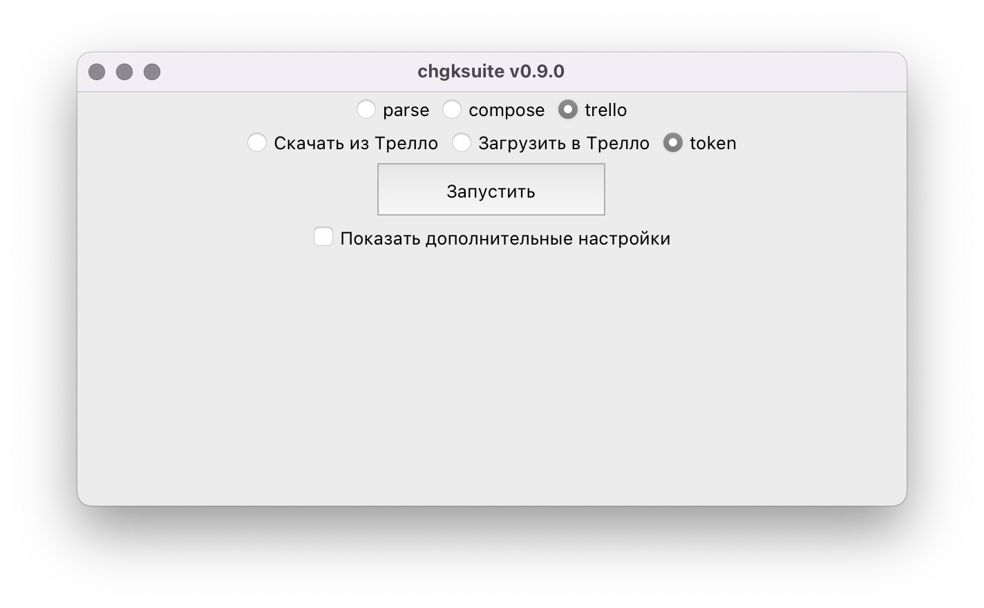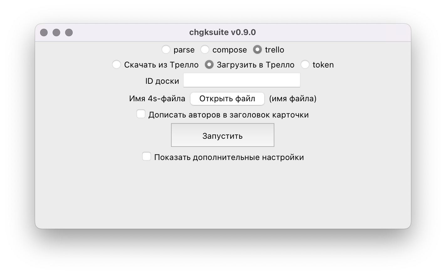 chgksuite живёт в парадигме, что одна доска в Трелло соответствует одной папке. Поэтому создайте папку, которая будет соответствовать вашей доске. В неё всякий раз будет выгружаться свежая версия пакета из Трелло. Откройте папку и нажмите «Запустить». Если вы ещё ни разу не скачивали с этой доски, Трелло попросит вас вставить в консоль ссылку на доску. Сделайте это, и тогда chgksuite скачает все списки с вашей доски — по одному файлу 4s на список. Готово, теперь вы можете работать с ними, как с обычными 4s-файлами — делать из них docx, выкладывать в Базу и ЖЖ.